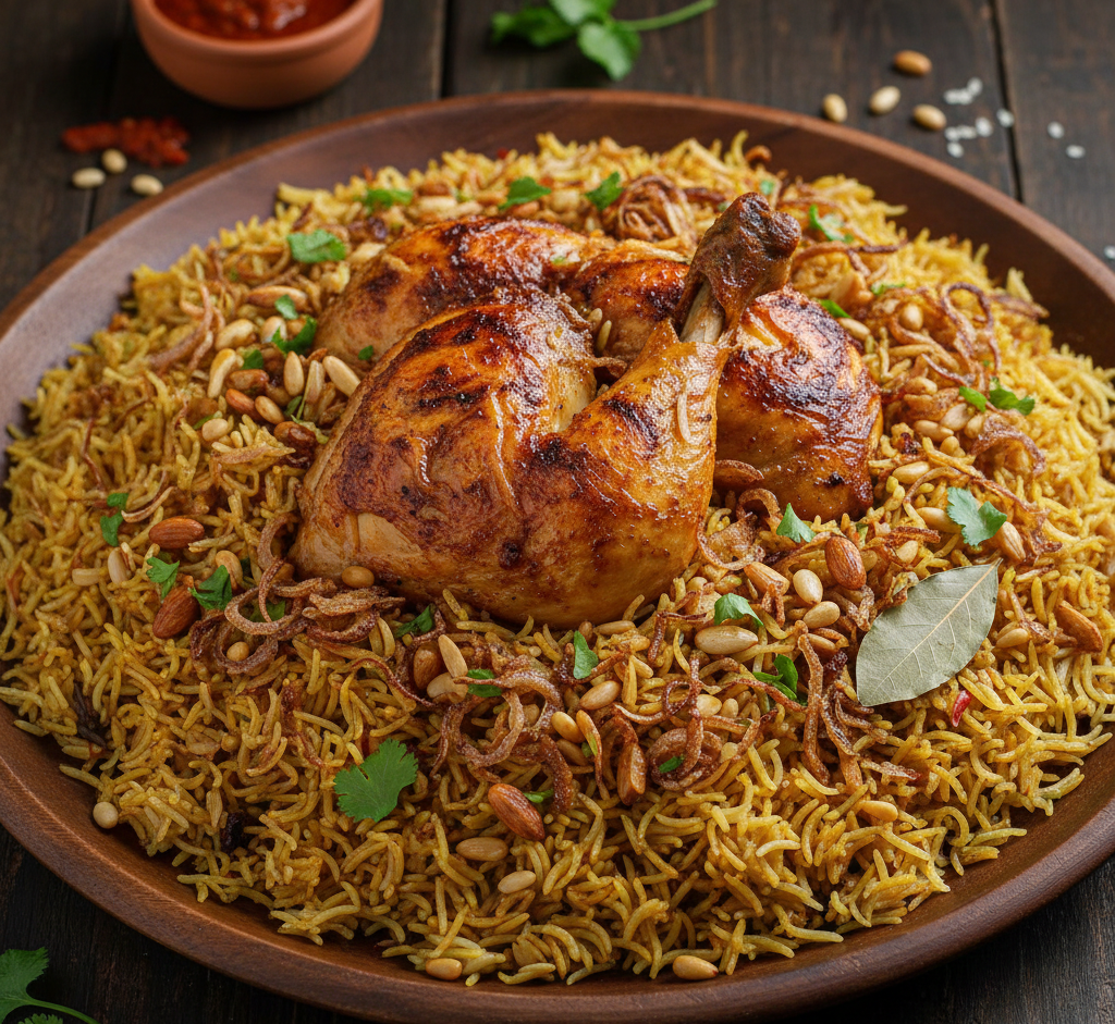 A classic Middle Eastern favorite prepared with aromatic basmati rice and perfectly roasted chicken infused with traditional spices. Slow-cooked for rich flavor and served in generous portions, ideal for large gatherings and corporate dining.