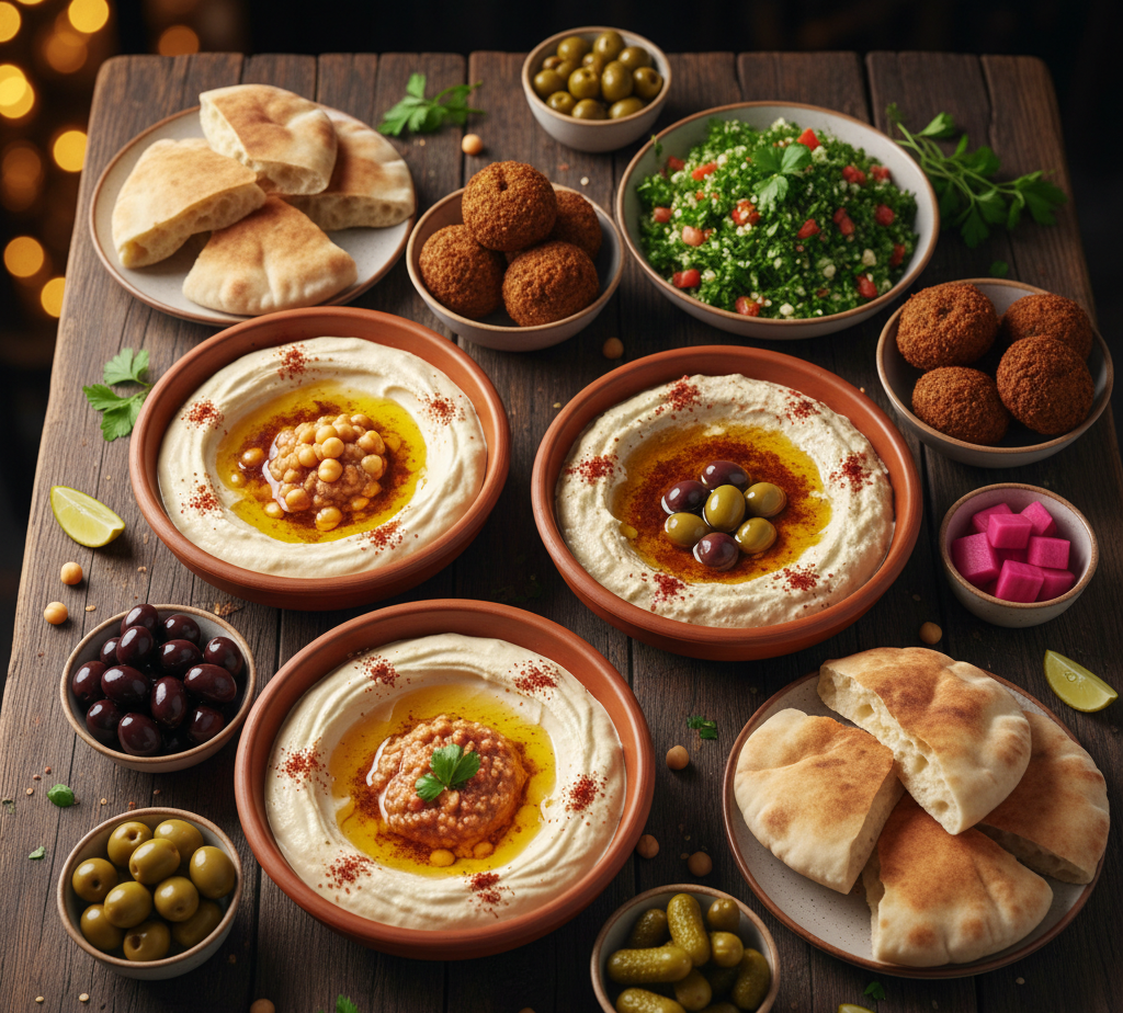 A vibrant assortment of traditional Middle Eastern starters made with fresh ingredients and authentic flavors. Ideal for sharing, receptions, and elegant catering setups.